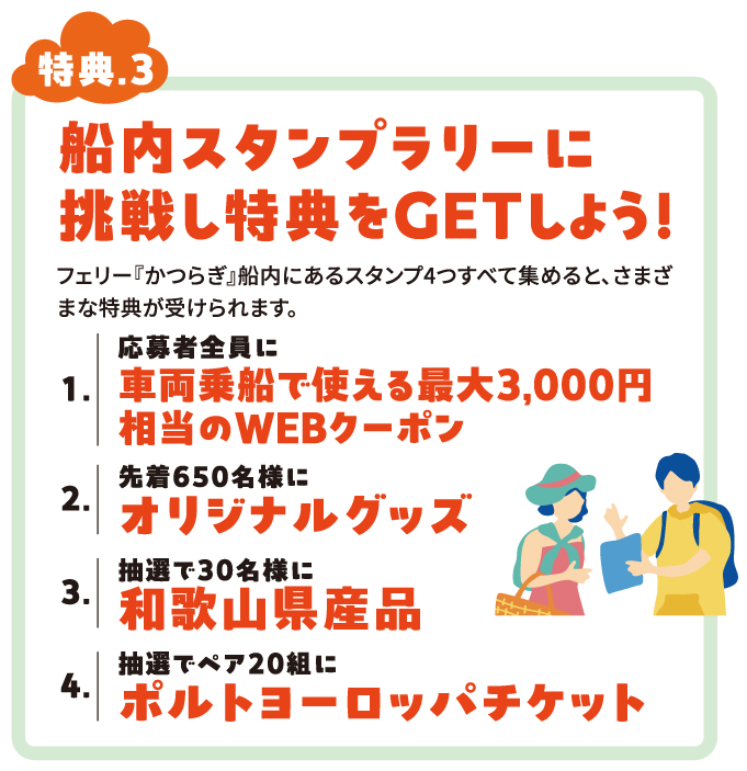 期間中は、和歌山と徳島を結ぶフェリー「かつらぎ」に乗るだけで、さまざまな特典やプレゼントがもらえます。