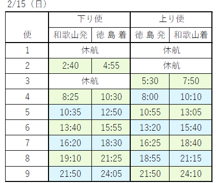 ※WEB表記:2月14日(土)26:45発 - 2月15日(日) 下り3便(和歌山港 5:30発)